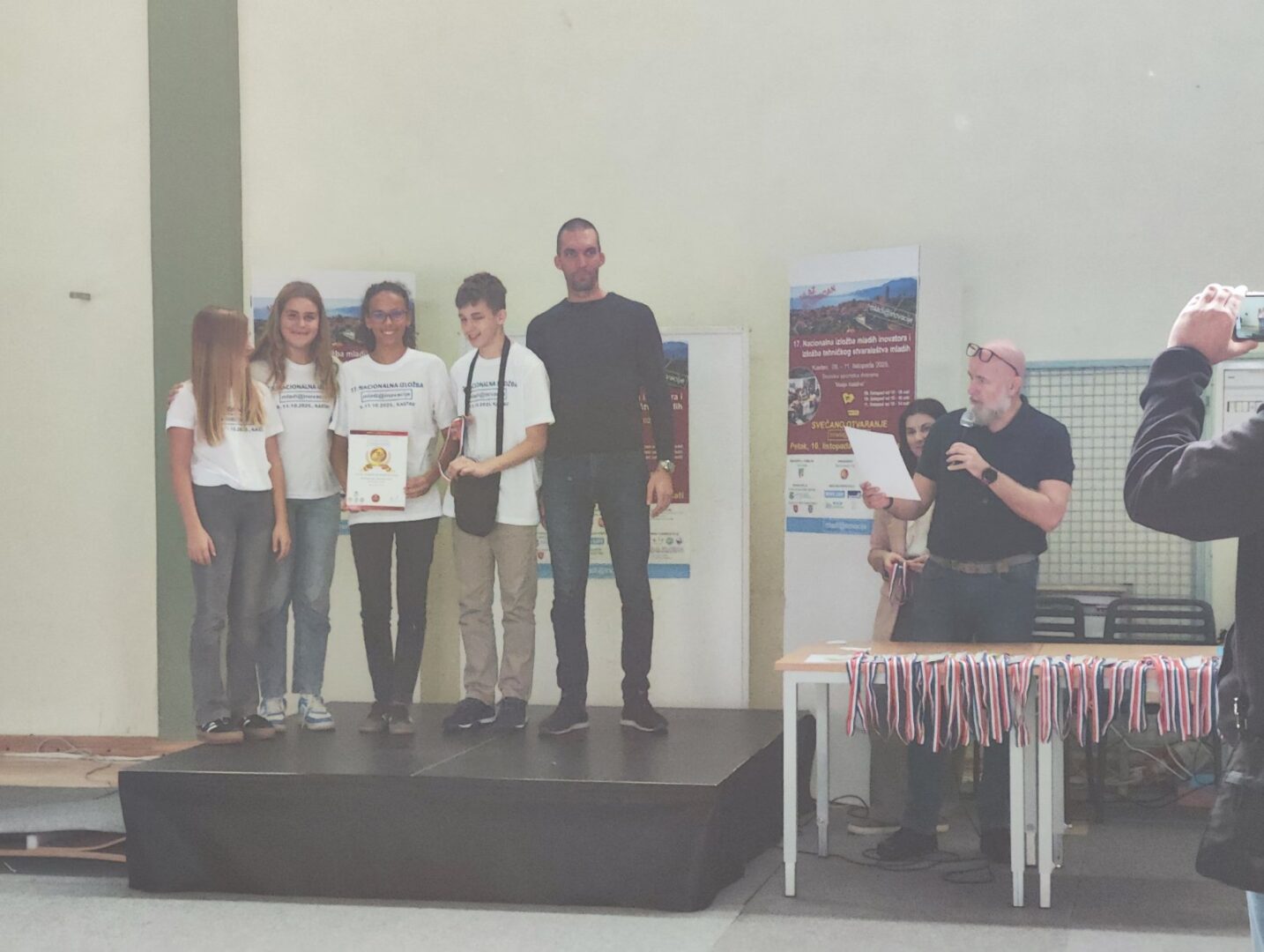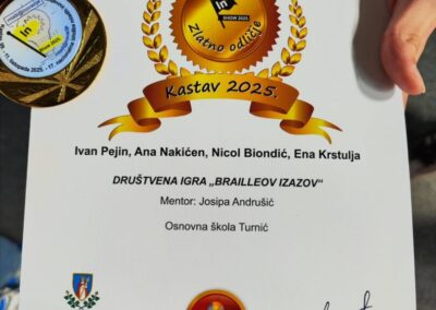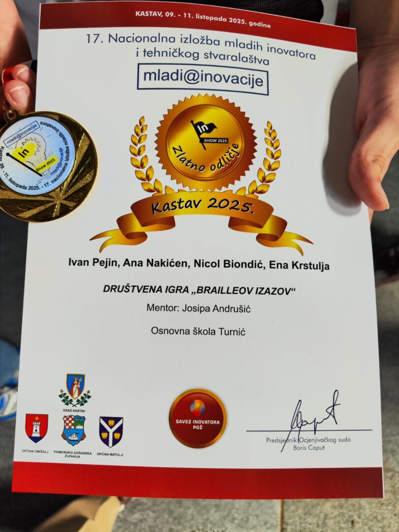 Na 17. nacionalnoj izložbi mladih inovatora i tehničkoga stvaralaštva (9.-11. 10. 2025.) u Kastvu, naša profesorica informatike, Josipa Andrušić, sa svojom je ekipom u sastavu Ivan Pejin, Ana Nakićen, Nicol Biondić i Ena Krstulja, još jednom postigla veliki uspjeh ovjenčan zlatnim odličjem za društvenu igru Brailleov izazov.