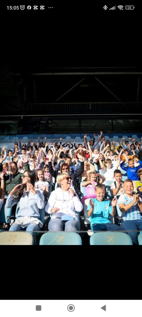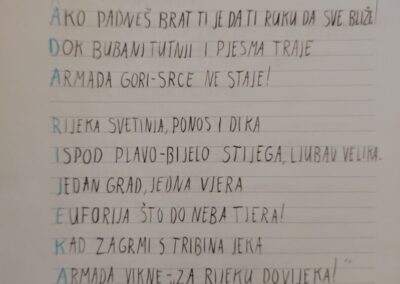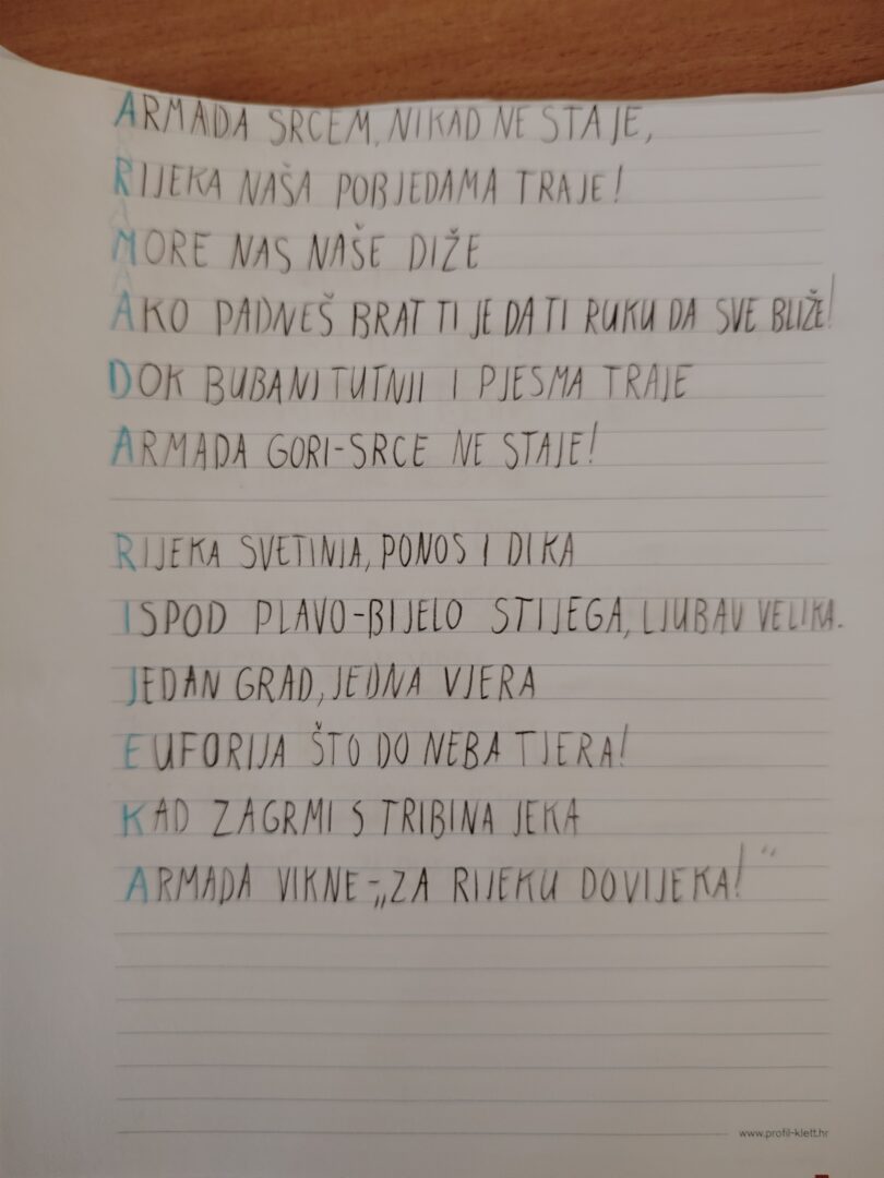 zahvalu za osvojenu dvostruku krunu. Do kraja tjedna, učenici su izrađivali umne mape, pisali akrostih, gledali kratke filmove te se okušali u slikanju Kantride ugljenom. Projekt završava u ozračju ponosa i zajedništva jer NK Rijeka nije samo klub, već dio identiteta svakog Riječanina. Tijekom projektnoga tjedna učenici su naučili da navijanje nije samo podrška s tribina, već i izraz pripadnosti, poštovanja i zajedničkog duha koji povezuje generacije. Plavo-bijela emocija još će se dugo osjećati u učionicama OŠ Turnić kao podsjetnik da snaga zajedništva i ljubav prema svome gradu uvijek pobjeđuju.