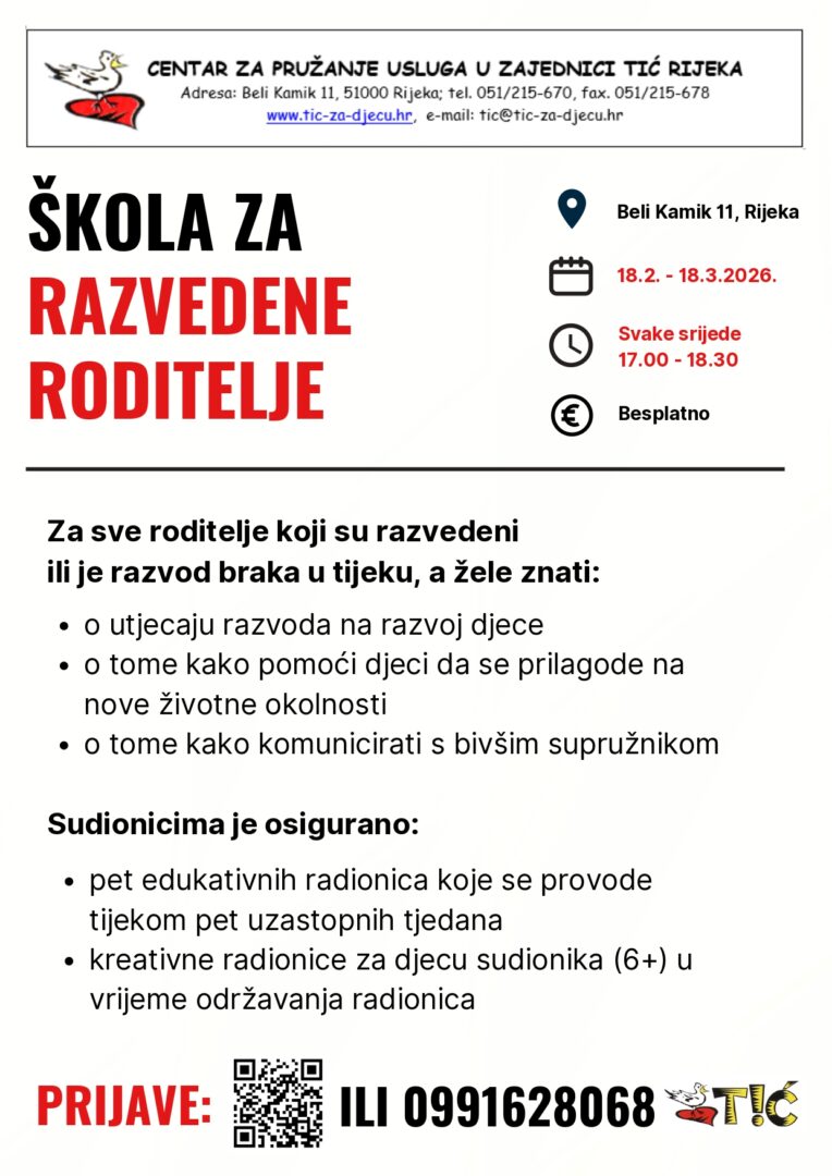 obavještavamo Vas da Centar za pružanje usluga u zajednici Tić Rijeka (u nastavku teksta: Centar) organizira novi ciklus radionica Škole za razvedene roditelje u razdoblju od 18.02.2026. do 18.03.2026 . Radionice će se održavati svake srijede od 17.00 do 18.30 sati u prostorima Centra, na adresi Beli Kamik 11 u Rijeci. Centar provodi ovaj program od 2007. godine, a namijenjen je roditeljima koji su razvedeni ili je proces razvoda braka u tijeku. Cilj programa je olakšati prilagodbu djece i roditelja na nove životne okolnosti, pomoći u smanjivanju opterećenja uvjetovanih rastavom uz jačanje roditeljske kompetencije u odgoju, a time i osjećaja zadovoljstva roditeljskom ulogom.